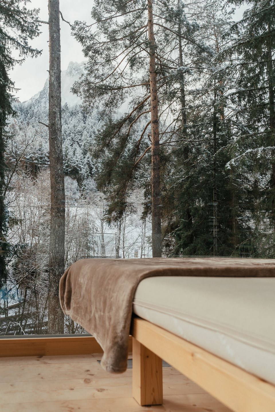 The spa facilities and wellness offerings are at the foundation of this spiritually-minded hotel. The aesthetic indoor and outdoor swimming pool reveals majestic views of the mountain from the warm, steaming pool that evaporates into the crisp air. Rooted in architecture that has been inspired by Japanese bathing rituals, a large framework of beds showcase the dense forest beyond, which in Autumn transforms into hues of gold.
