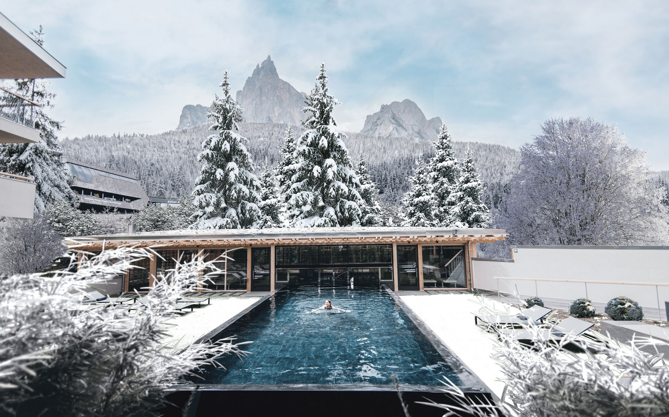 When you’re swimming towards Alpe di Siusi meadow in the stunning spa at “Sensoria Dolomites”, everything’s wonderful, whatever the weather.